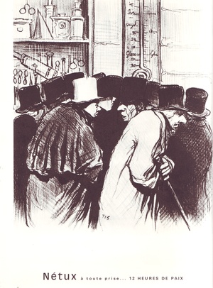 Honoré Daumier est un précurseur de la caricature, notamment médicale. Il a publié dans de nombreux magazines du XIXème siècle. L’intérêt de cette série diffusée par les Laboratoires Roussel et d’utiliser différents dessins tirés du magazine Charivari pour l’essentiel et d’illustrer différentes scènes ayant un rapport direct ou indirect avec la grippe, et ce afin de promouvoir leur médicament Nétux.